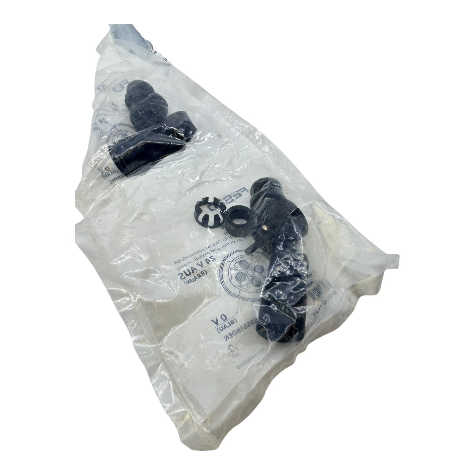 Spannung: 24 V (rot), 24 V AUS (braun), 0 V (blau)
