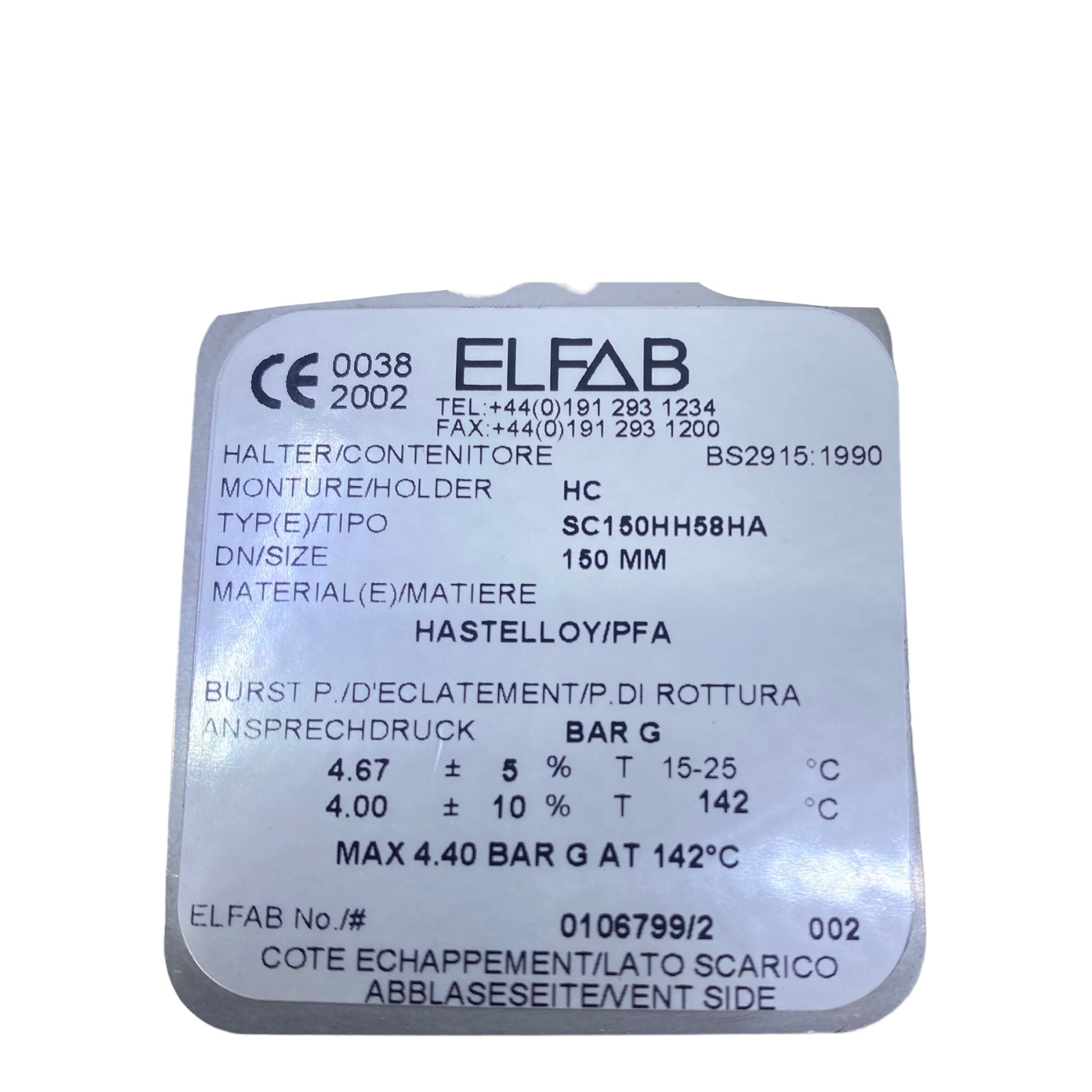 Elfab SC150HH58HA Rupture Disc 150mm 4.40 BarG