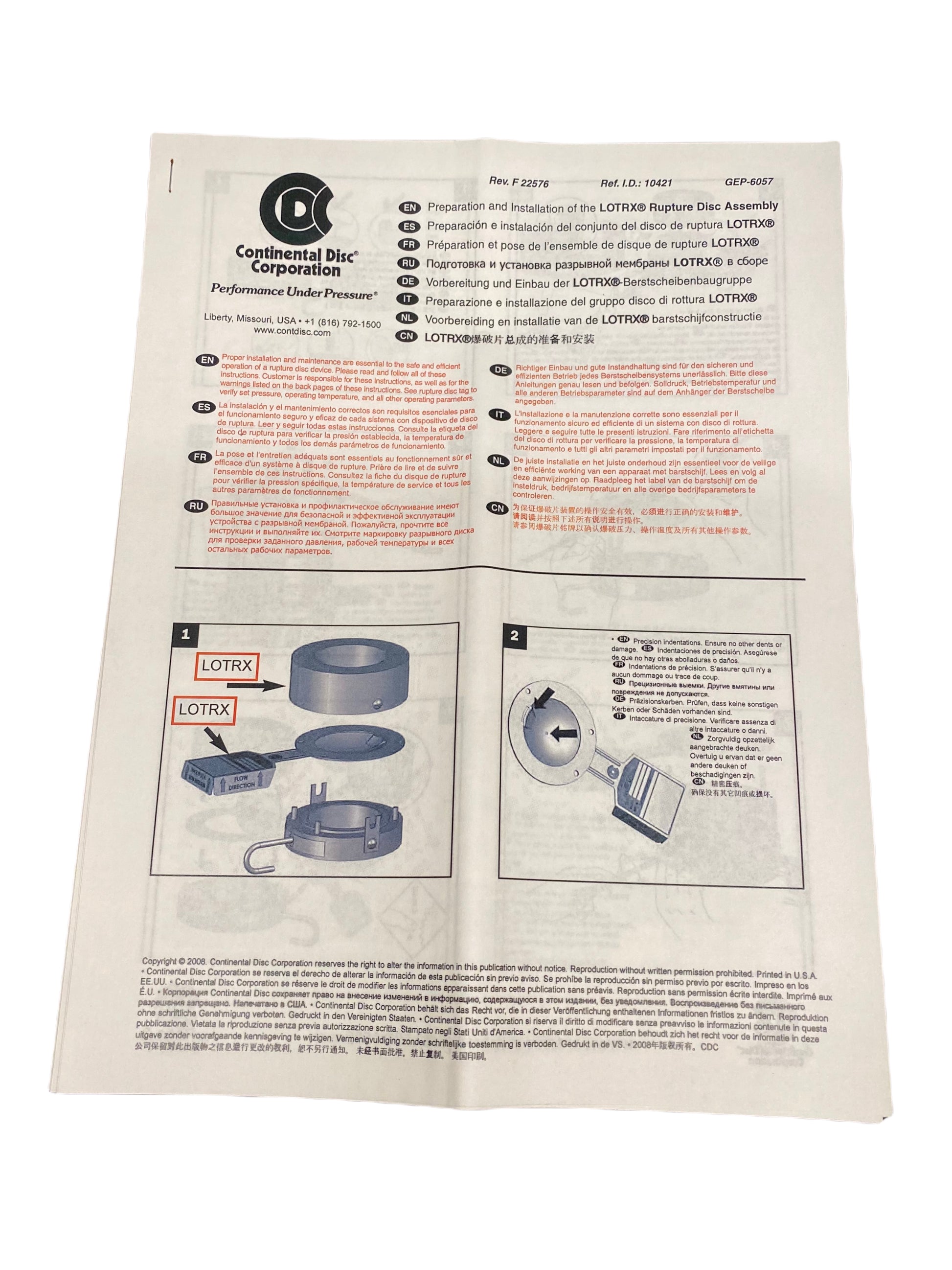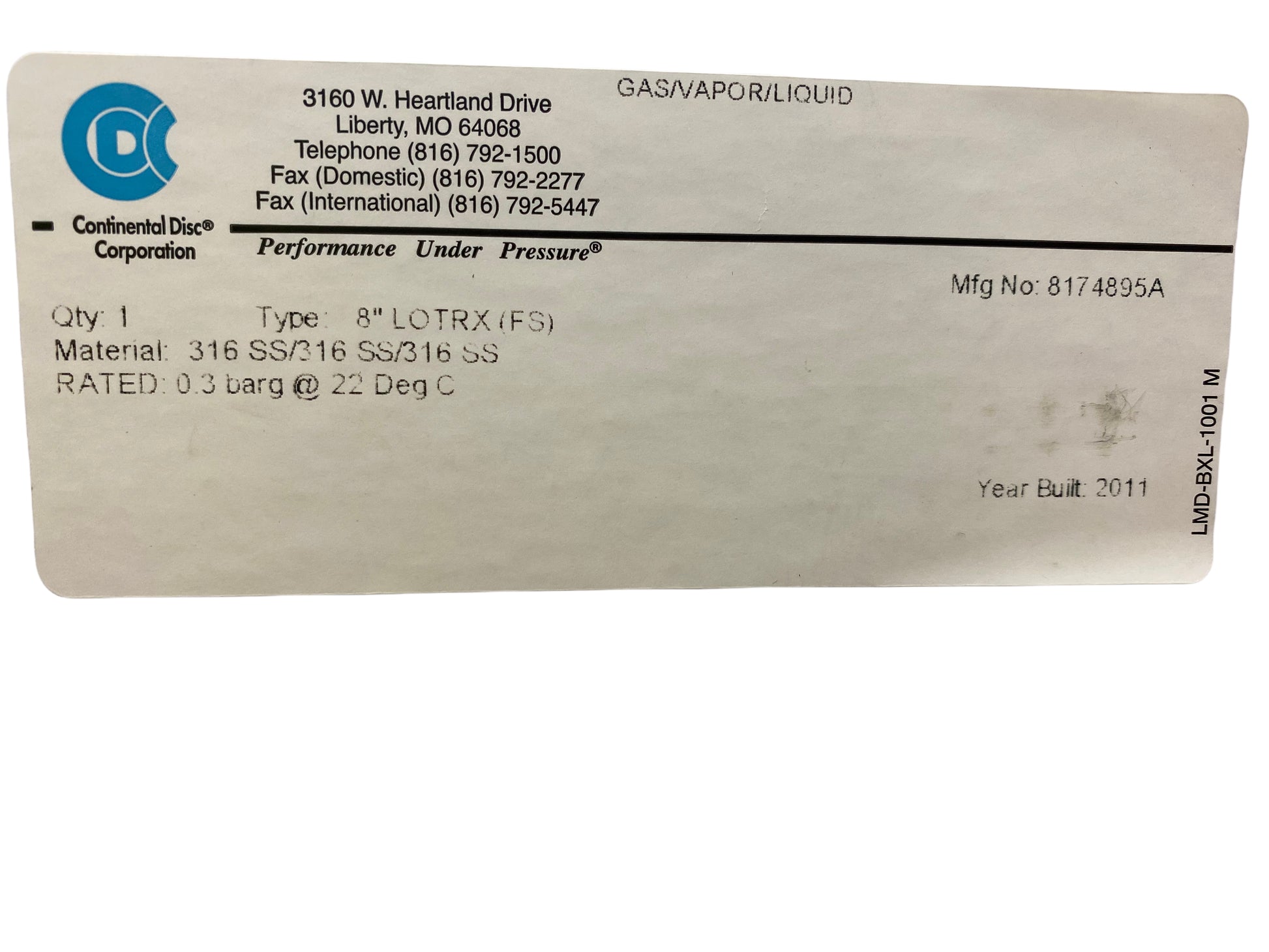 Continental Disc Corporation Rupture Disc 8' LOTRX (FS) 0.3 Bar 1.5 psig - 30 psig