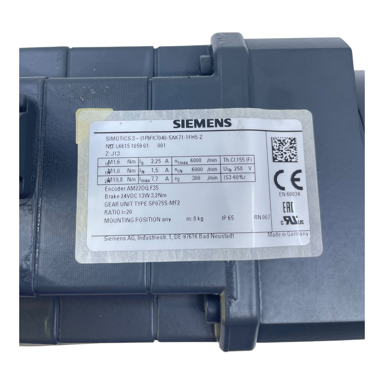 Siemens Servomotor mit Getriebe 1FK7040-5AK71-1FH5-Z Servomotor von Siemens